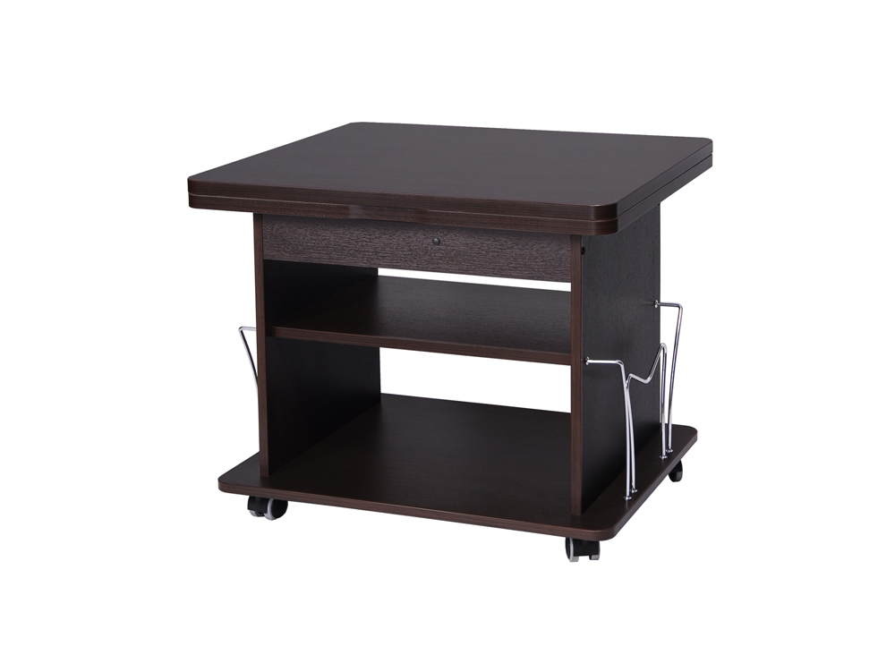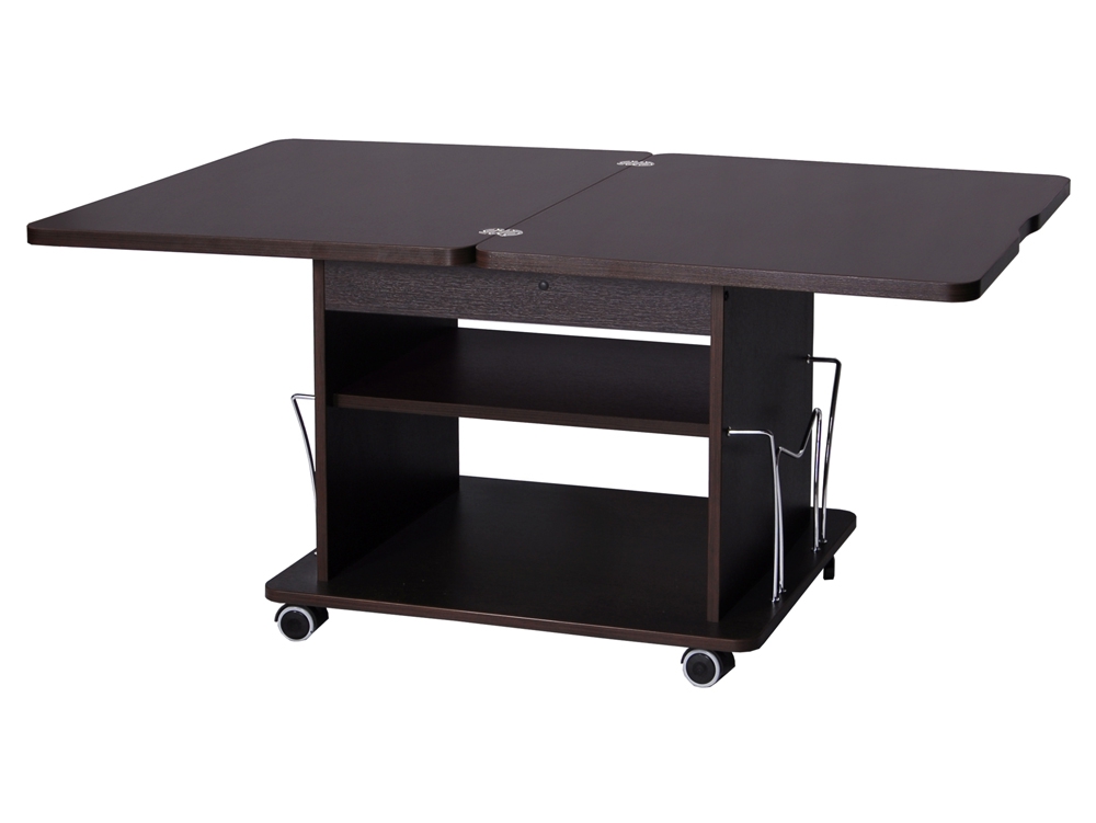 Газетница из металла добавляет изделию функциональность, а колесные опоры делают стол мобильным.